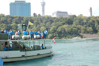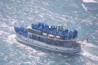 ส่วนไฮไลท์ของงานนี้อยู่ที่การนั่งเรือไปชมน้ำตกไนแองการ่าอย่างใกล้ชิด เรียกได้ว่าถ้าใครไม่ได้นั่งเรือไปชมไนแองการ่าถือว่ายังมาไม่ถึงค่ะ ไหนๆก็มาแล้ว เลยต้องเบียดเสียดกับฝูงชนมากมายและการเข้าคิวรอเรือน้อยคอยรัก ชื่อของทัวร์ล่องเรือก็เก๋ไก๋ดีค่ะ เรียกว่า Maid of the Mist หรือ เงือกน้อยในสายหมอก ราคาทัวร์ล่องเรือ สำหรับผู้ใหญ่ก็ประมาณ 33 ดอล สำหรับเด็กๆก็ประมาณ 26 ดอลค่ะ เมื่อมาถึงคิวแล้ว ทุกคนก็จะได้รับแจกของ คล้ายเสื้อกันฝนสีฟ้า เอาไว้ใส่ป้องกันละอองน้ำที่จะกระเซ็นมาโดนตัวค่ะ คนไทยถือว่าโดนละอองน้ำแค่นี้เป็นเรื่องจิ๊บจ๋อยค่ะ พวกเราโดนน้ำสาดกันหนักมากกว่านี้ในช่วงสงกรานต์ แต่เอาเถอะ เขาบังคับให้ใส่ก็ต้องใส่